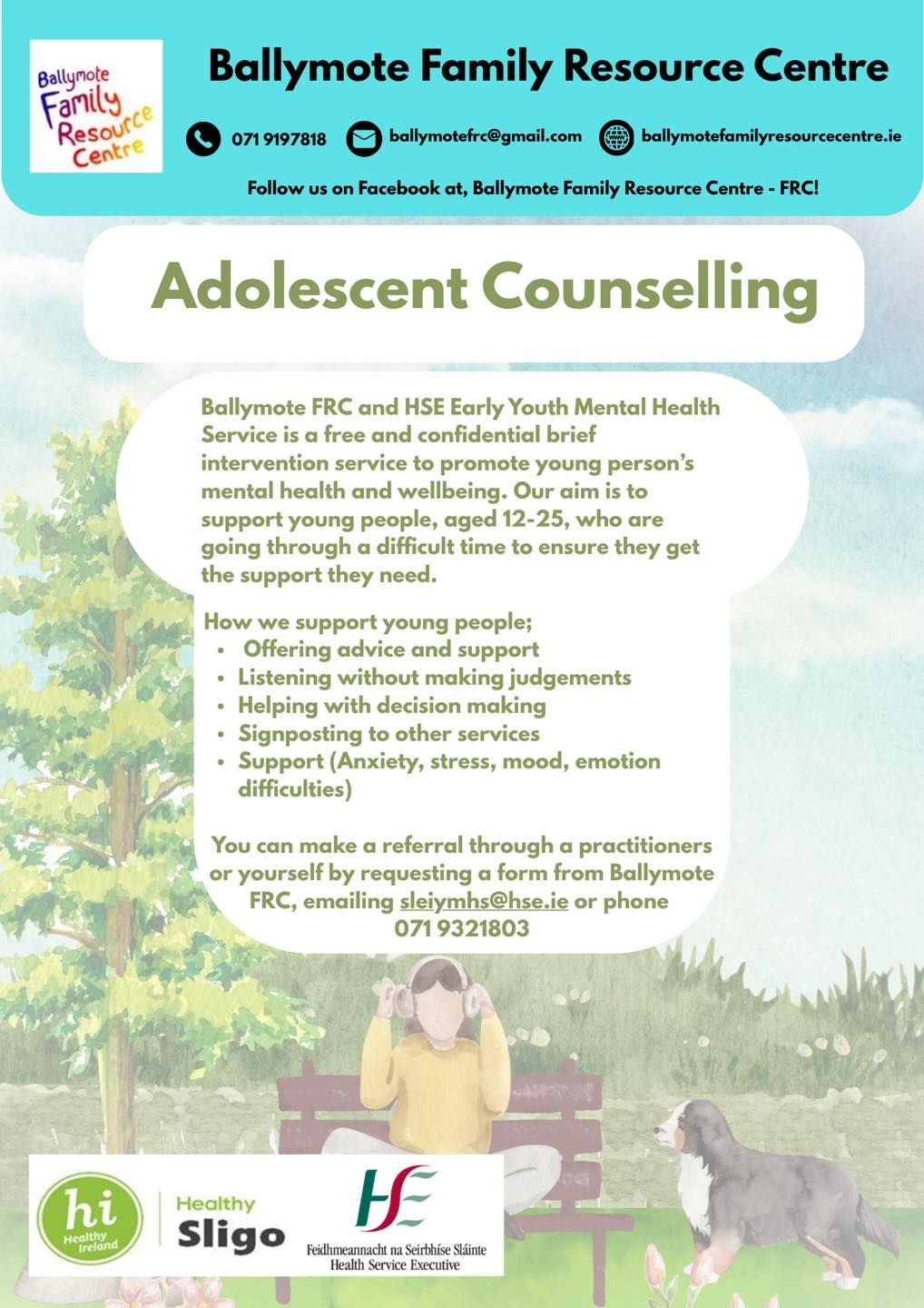 Ballymote Family Resource Centre, in partnership with the HSE Early Youth Mental Health Service, offers a free and confidential counselling support service for young people aged 12–25.