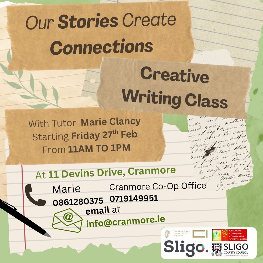 Join tutor Marie Clancy for an Introduction to Creative Writing, starting Friday 27th February 11 am - 1pm at Cranmore Community Office, 11 Devins Drive.