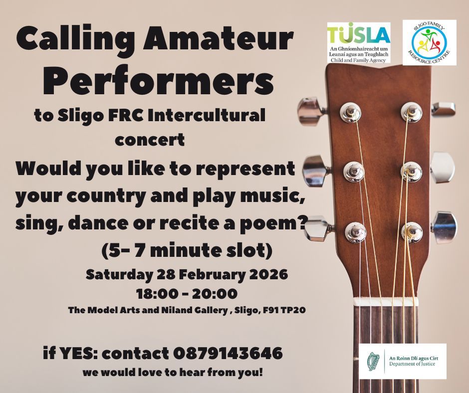 Sligo Family Resources Centre are putting a call-out for performers from various countries to do a 5 minute performance in a very informal setting in the Black Box Theatre on Saturday 28 February 2026.