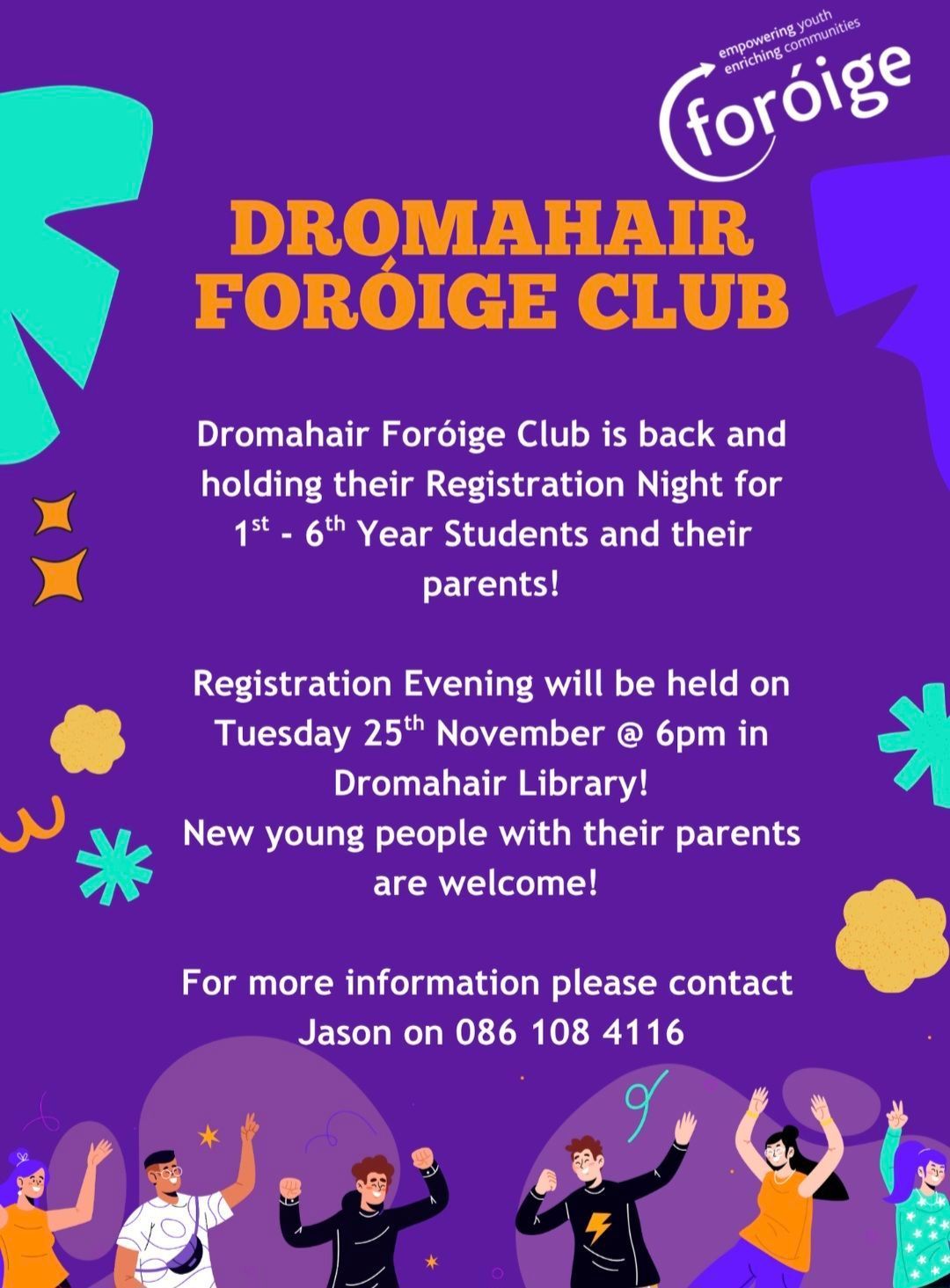 Dromahair Foróige Club is holding their Registration Evening on Tuesday 25th November from 6-7pm in Dromahair Library for new members and their parents!