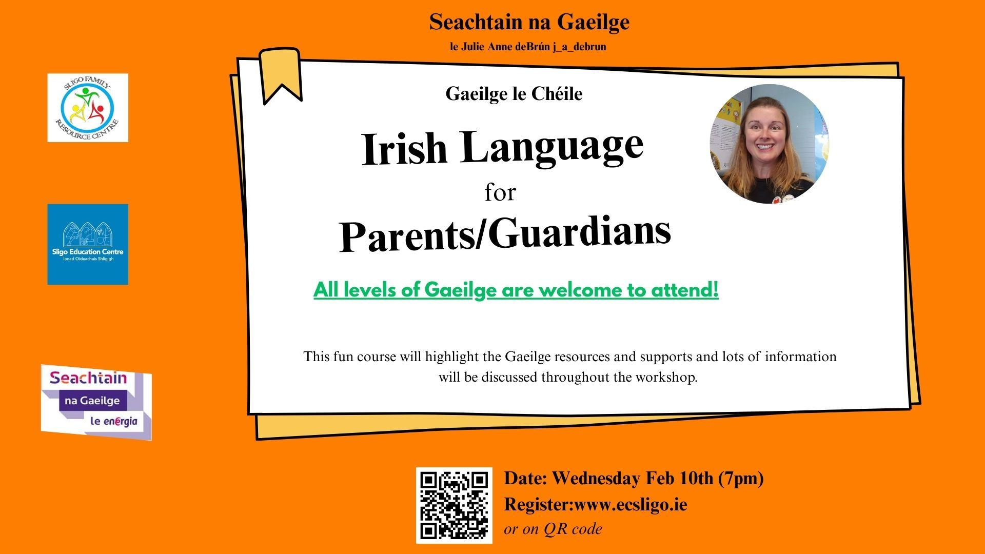 Bígí linn chun smaointí difriúla a fháil chun an Ghaeilge a spreagadh sa mbaile. Feicfear na háiseanna is tacaíochta ó thaobh na Gaeilge de agus beidh neart eolais a scaipeadh le linn an gceardlann. Tá fáilte roimh gach leibhéal Gaeilge!
