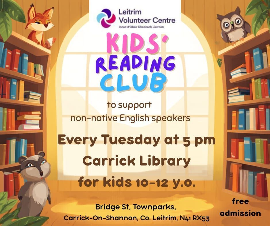 Leitrim Volunteer centre are happy to invite children aged 10-12 to join the Reading Club! The Club was created to support non-native English speakers to build confidence in their reading and school studies.