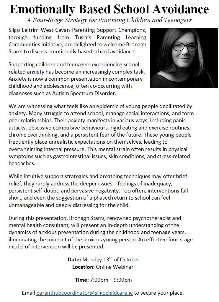 Bronagh Starrs is a renowned psychotherapist and mental health consultant. She aims to support parents of primary aged children as well as those parenting teenagers by presenting a four stage model of intervention.