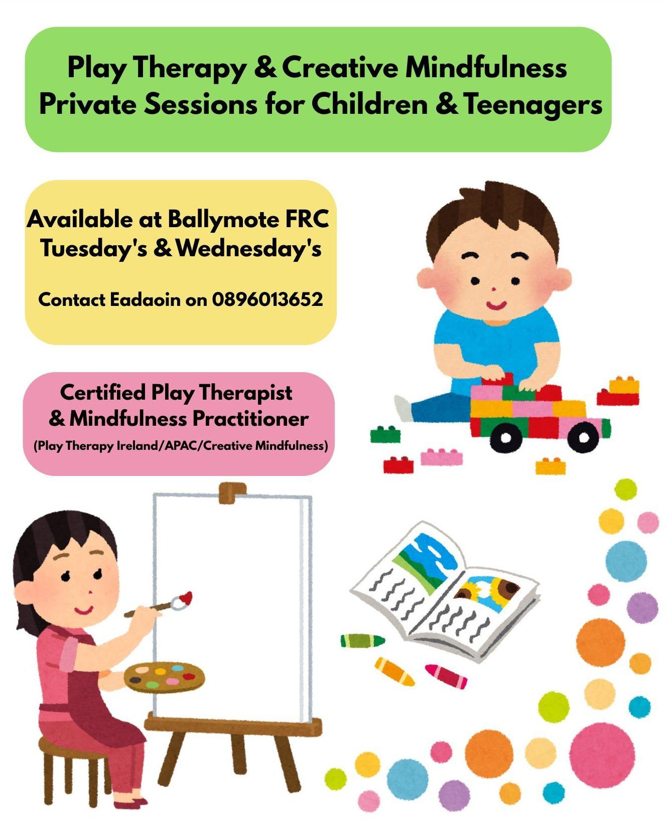 Play Therapy and Creative Mindfulness sessions will be running Ballymote Family Resource Centre on Tuesday's and Wednesday's.