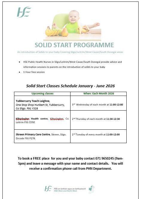 The solid start programme is a FREE education programme provided by Public Health Nurses to parents when their baby is aged between 4-6months.