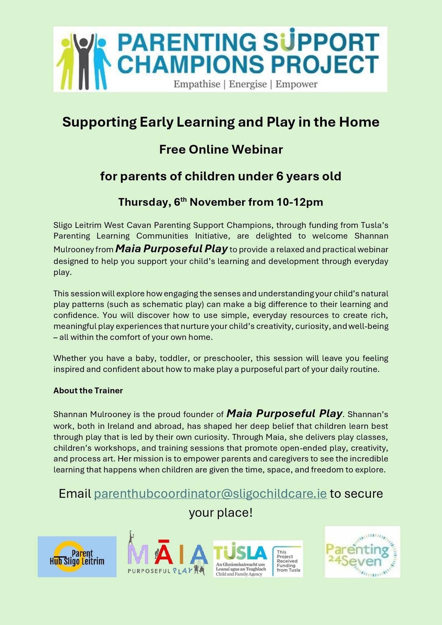 Sligo Leitrim and West Cavan Parenting Support Champions upcoming webinar called ‘Supporting Early Learning and Play in the Home.’